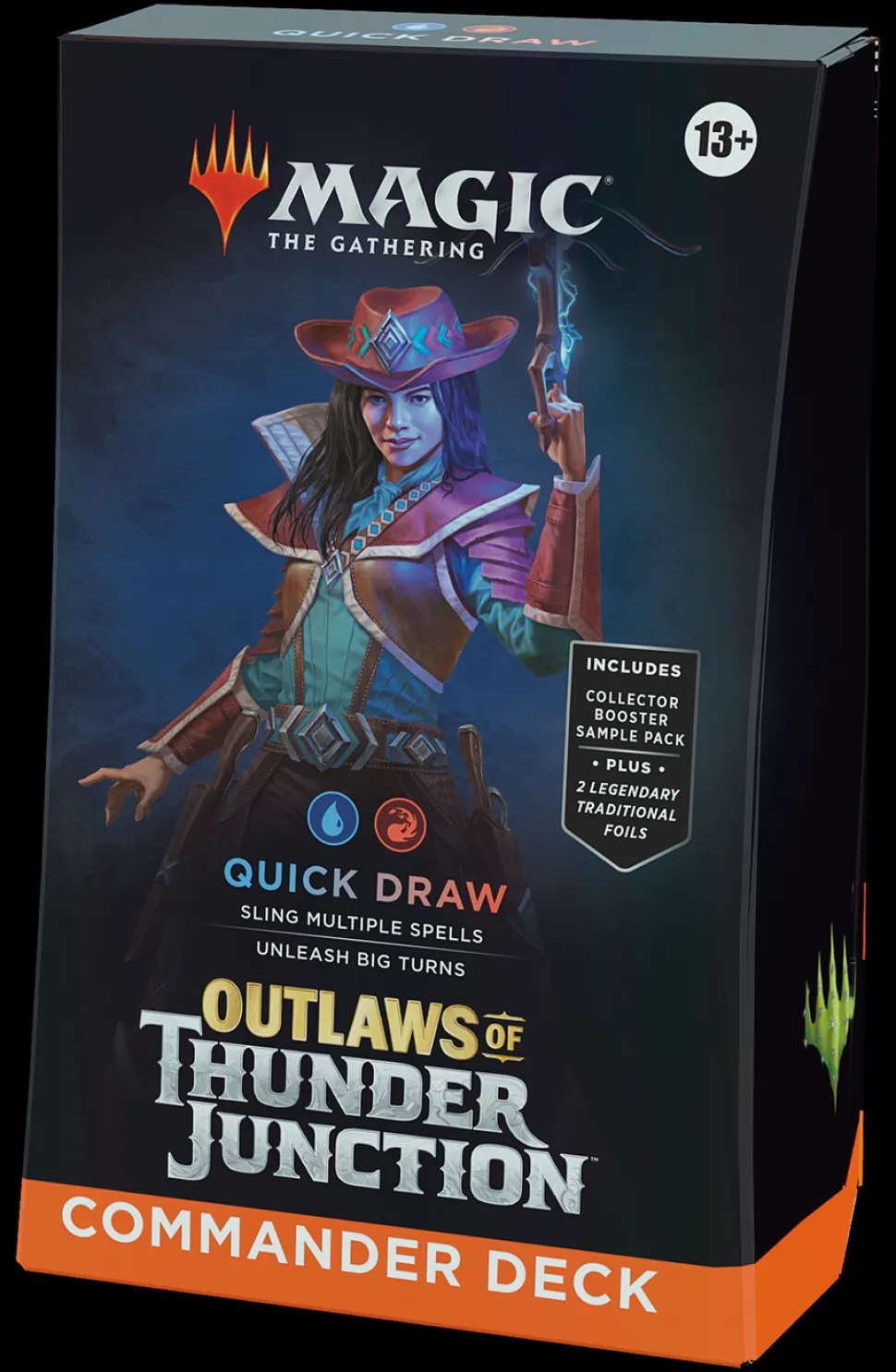 In Commander, four players come together to show their strength and strategy, with one player coming out on top. Each 100-card ready-to-play Outlaws of Thunder Junction Commander Deck makes it easy for Commander fans in your store to grab a deck and play right away.