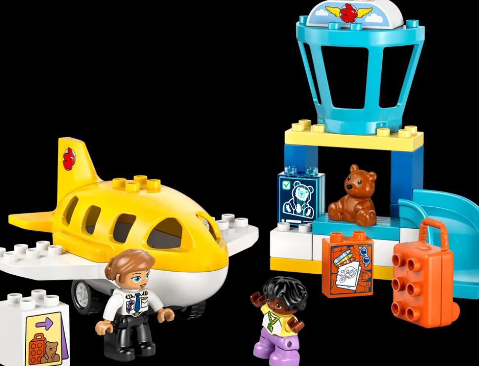Dette LEGO® DUPLO® flyplasslekesettet har mange detaljer som stimulerer barn til fantasifull lek. Settet inkluderer en sikkerhetskontroll-skranke, hvor barn kan leke at de skanner kofferten og sender den ned bagasjerennen, et kontrolltårn og et lekefly på hjul med plass til kosebamse, et barn og en pilot.
