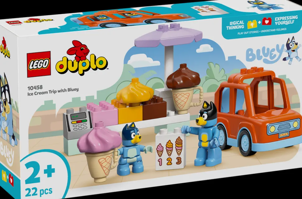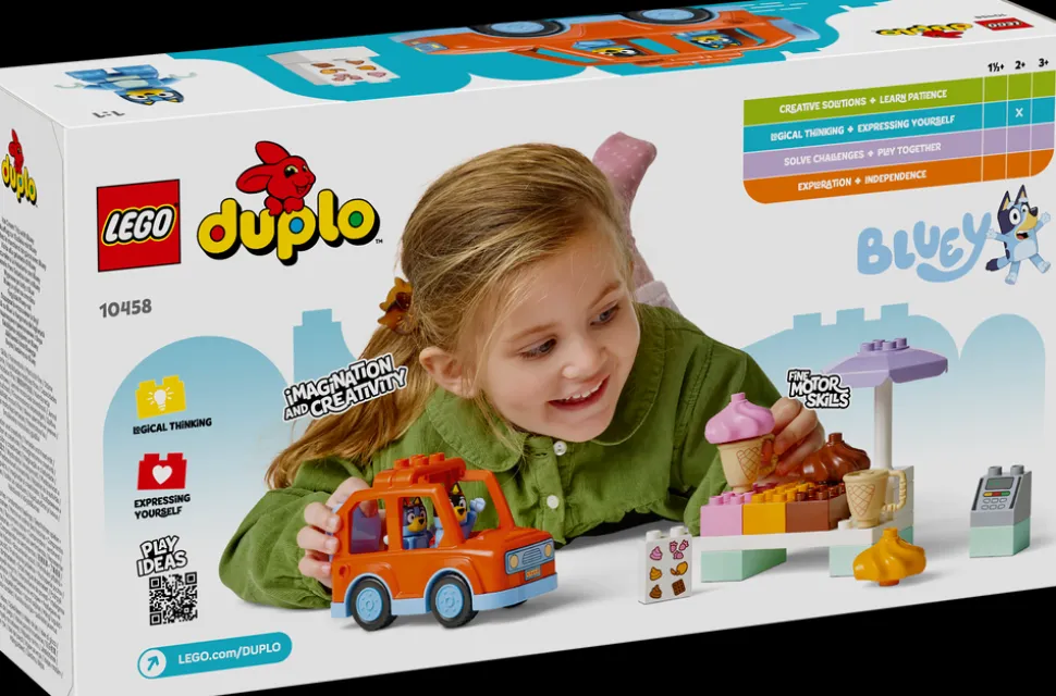 - Lekesett med iskremkiosk og kjøretøy, inspirert av TV-serien Bluey – ta med små barn til Heeler-familiens gøyale verden med småbarnlekesettet LEGO® DUPLO® På iskremtur med Bluey