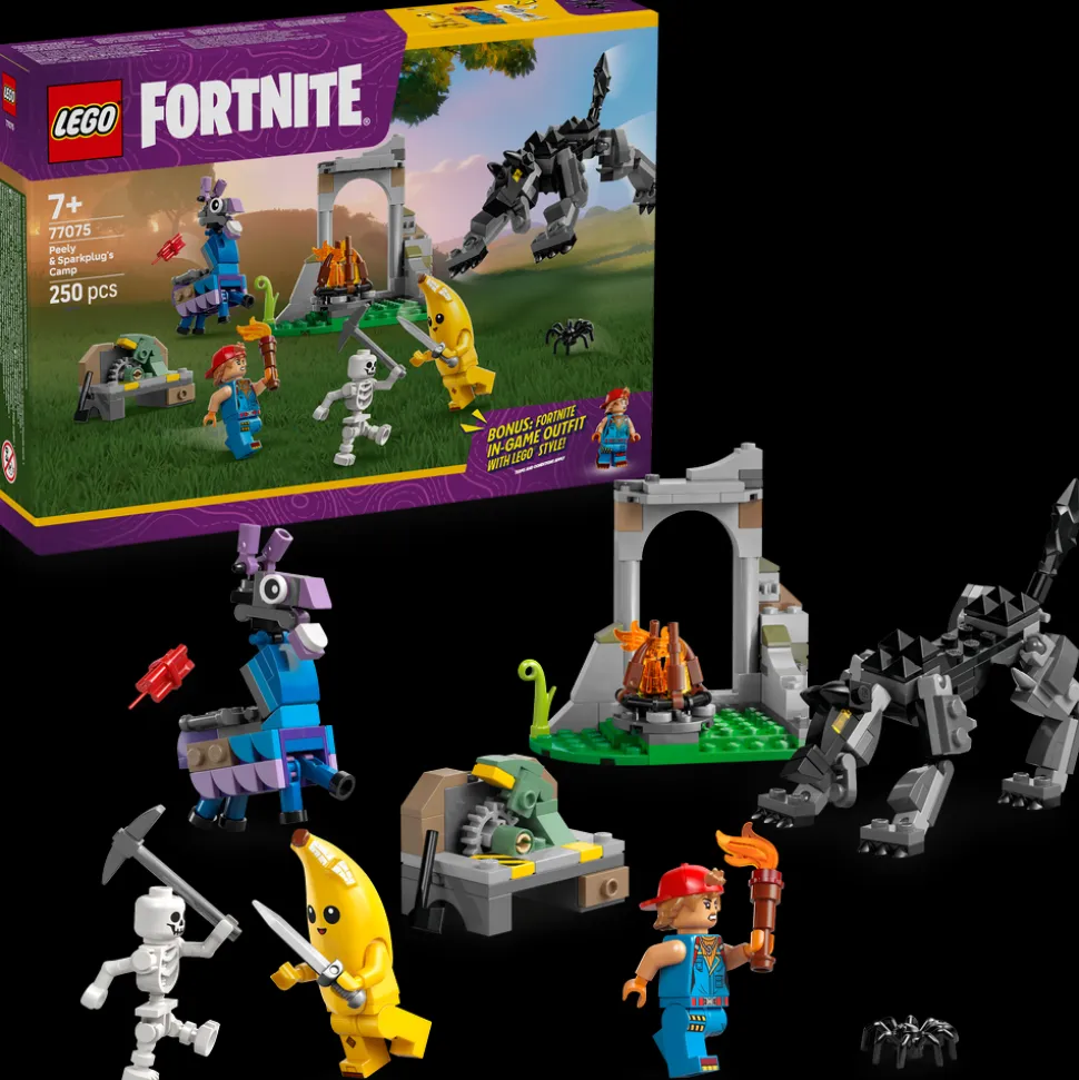 - LEGO® Fortnite® lekesett – inspirer barn fra sju år til fantasifull lek med byggesettet Peely og Sparkplug slår leir på sletten