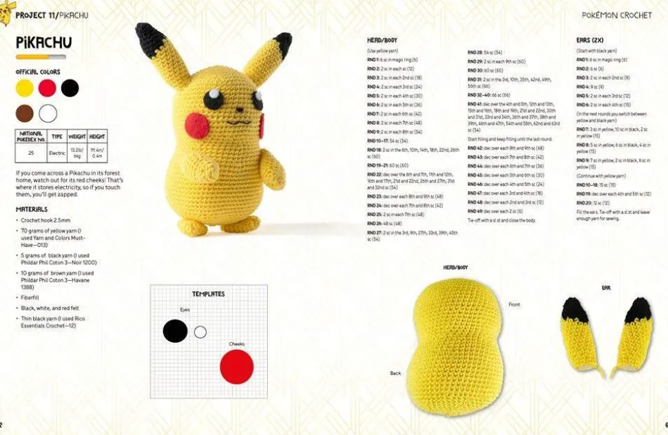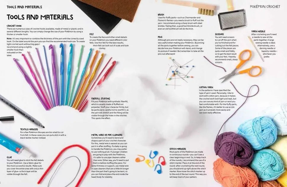 All Pokemon trainers need to train – themselves and their Pokemon. The same is true with crochet. To help in your training, the book starts with a how-to guide to understanding crochet patterns, then explains and demonstrates the various stitches needed to make the Pokemon. Then it addresses the special techniques you’ll need to master, which tools and materials you’ll need, and then how to put everything together to make a perfect Pokemon plushie.