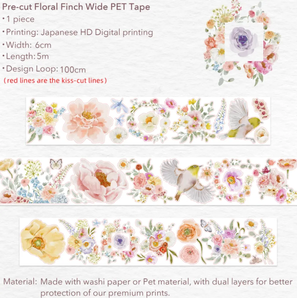 - Pre-cut Floral Finch Washi or PET Tape 60mm×5m