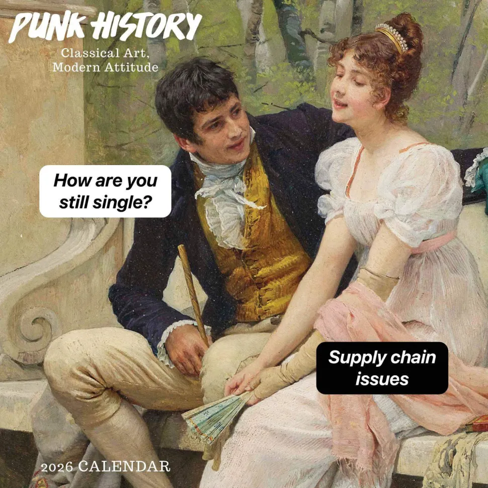 - Each monthly spreadfeatures witty and sarcastic captions paired with vibrantclassical art