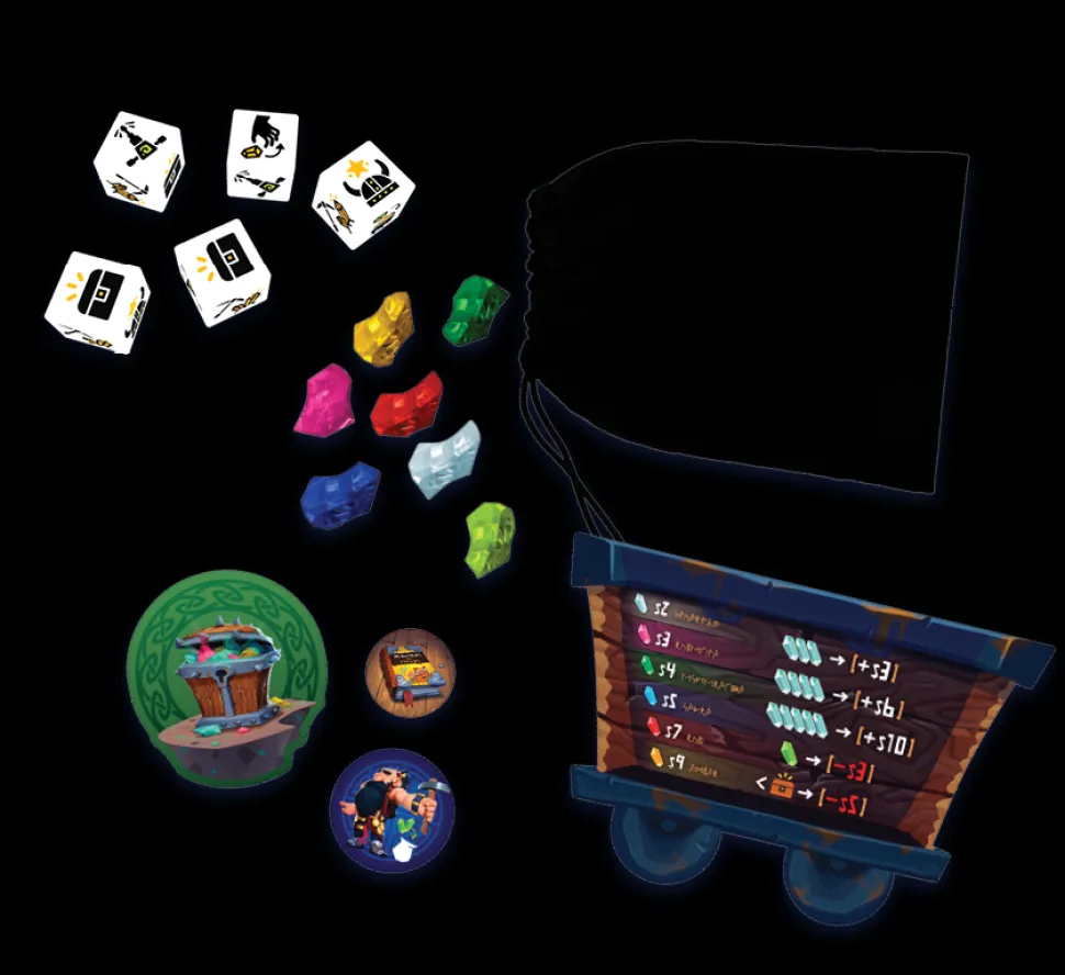 It seems that new mines keep being discovered… But these mines aren’t that big and all the dwarves will have to run to get the most out of them in just one day! In this dice version of Quartz, the bet remains the same: Everyone must explore the mine and sell the mined crystals in the city at the end of the day. The dwarf who manages to collect the most money will have the mine all to himself.The game is divided into six rounds. On their turn each player must:1. Mine a crystal:The player draws a crystal from the bag and places it on his cart.If the mined crystal is an unstable crystal, the player receives areroll marker. There is no limit to the number of reroll tokens a player can have.2. Roll the dice:Each player has up to three dice rolls per turn. In the first, all 5 dice must be rolled. In the second and third they can reroll as many dice as they want. If it has a Reroll Marker, the player can discard it to perform an extra reroll.3. Perform actions:According to the result of the dice the player will be able to perform one or more actions. The more faces of the same action are available, the more efficient that action will be. Actions allow the player to mine more crystals, steal crystals, store crystals in the chest, or transfer unstable crystals to opponents.At the end of the game everyone receives points according to the value of the crystals they have, being entitled to bonus points for collections of equal crystals. Each unstable crystal will penalize its owner 3 points less and the player with the fewest crystals in the chest loses 5 points.