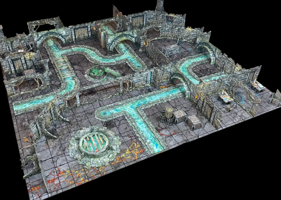 The Ravenskeep Sewers can be combined with our Dungeon Terrain to transform your gaming area into the bowels of a thriving city. One pack is enough to turn a full 2’x2′ gaming area into a network of sewer channels, all with raised edges for a 3D effect. It also includes arched walls for the sewer to pass through and a variety of drains, grates, manholes and ladders.