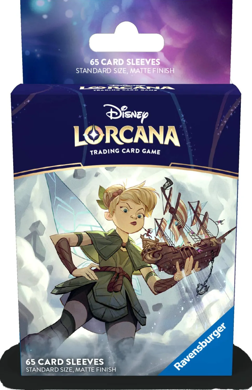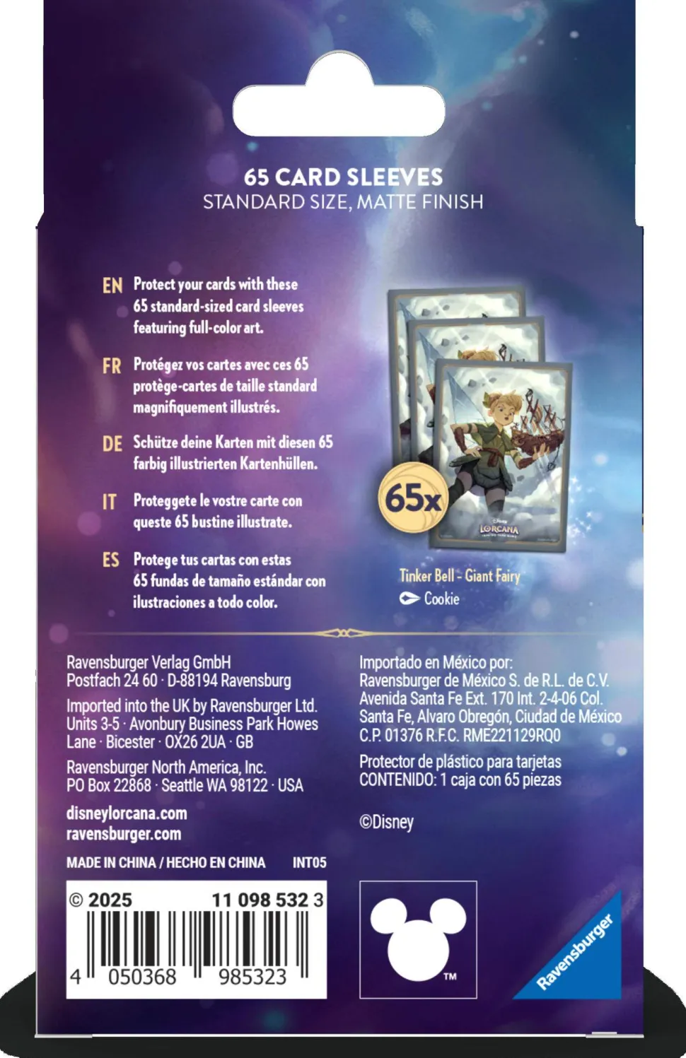 Protect cards from wear and tear during play with card sleeves featuring card art of Mickey Mouse – Wayward Sorcerer and Enchanted card art of Tinker Bell – Giant Fairy. Each pack includes 65 matte-finish Card Sleeves.