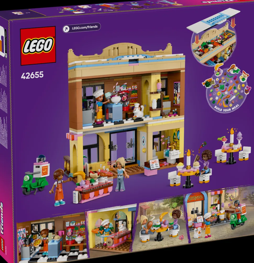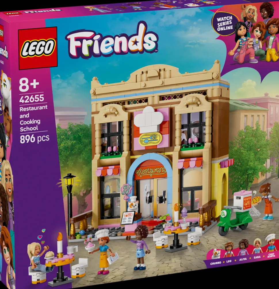 Gjør barns rollelek til et gourmeteventyr, hvor jenter og gutter fra åtte år kan finne på smakfulle retter på LEGO® Friends Restaurant og kokkeskole (42655). Det detaljerte rollelekesettet inkluderer en toetasjes bygning med kokkeskolekjøkken og utendørs spiseområde samt fire minidukker og en kattefigur. Settet er en flott bursdagsgave til barn som liker kreativ lek.
