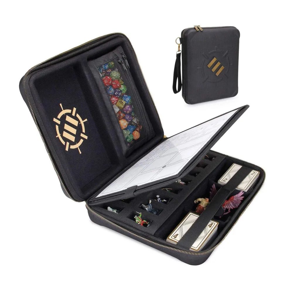 An all-in-one storage case for RPG players. Features a unique binder design with custom compartments for dice, miniatures, class ability cards, and more. Also features two sides, each with various compartments. The left side has a large dice rolling tray, a removable pencil/accessory pouch, and a spare document compartment behind the dice tray area. The right side is a foam tray with 16 slots for miniature figures and a modular section for storing cards, dice, and other accessories. In the center is a divider with a transparent panel to store and protect a character sheet; players can write directly onto the transparent panel with dry erase markers—a unique feature of the ENHANCE RPG Organizer Case.