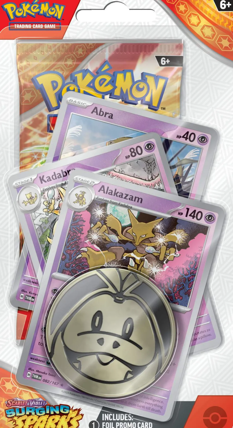 The Pokémon Surging Sparks Premium Checklane contain: 1 Booster pack, 3 promo cards and 1 coin.