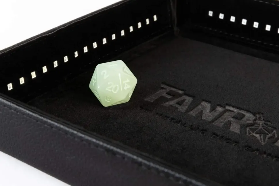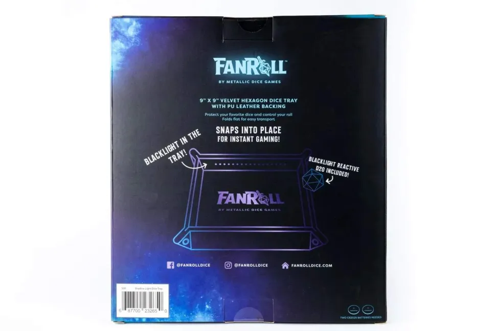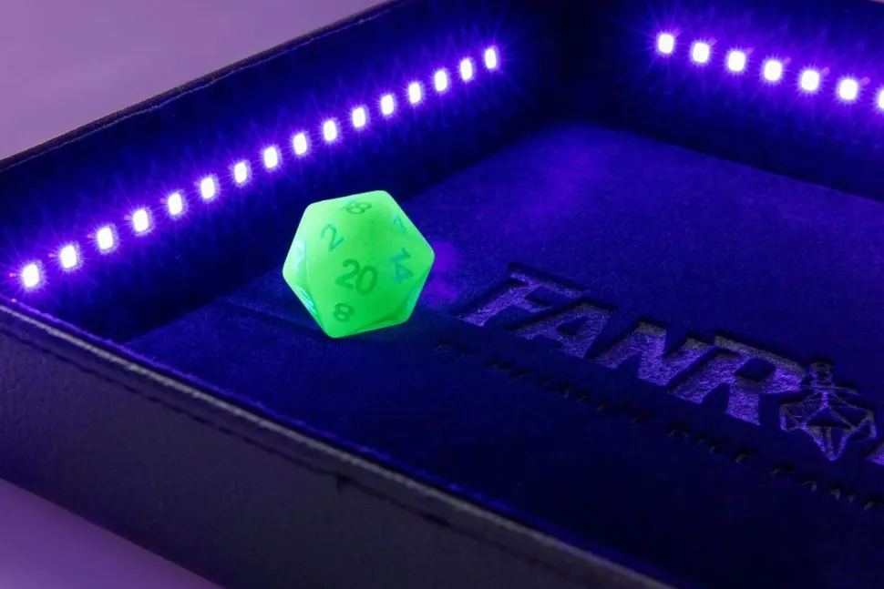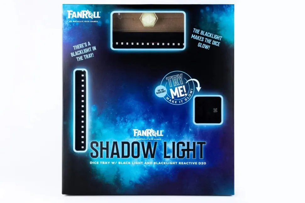 Introducing the newest technology to hit the tabletop, Shadowlight Dice Trays. These dice trays have black lights incorporated into the side of the tray to illuminate your tray. Each tray comes with a specialized D20 made to interact with blacklight and bring an incredible glow to your table. Tray’s are built with auto-shutoff switches to save the batteries and these pair well with our Shadow Light Elixir Dice.