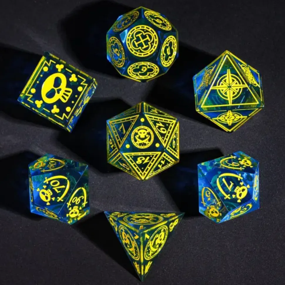 Et sett med syv forskjellige terninger, som passer til rollespill. Inkluderer: D4, D6, D8, D10, D12, D20 og en prosentterning.