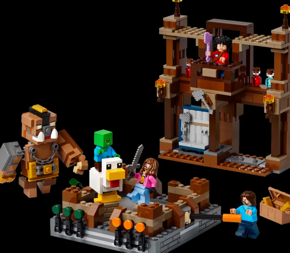 LEGO® Minecraft® byggesettet inkluderer lekefigurer fra filmen – Steve, Garrett, Henry, en zombieunge, en hønse-jockey og en bevegelig figur av Storsvinet – samt våpen og eliksirer som barn kan bruke i kampscener og når de drar på oppdagelsesferder på egen hånd. Settet inkluderer en kamparena med poengtellere og håndtak som barn kan feste på kampdeltakerne. Det er også en palassfasade med kiste og våpenstativ som kan tas av. Barn kan få digital moro med LEGO Builder appen, hvor de kan zoome inn, rotere modeller i 3D og spore framdriften.