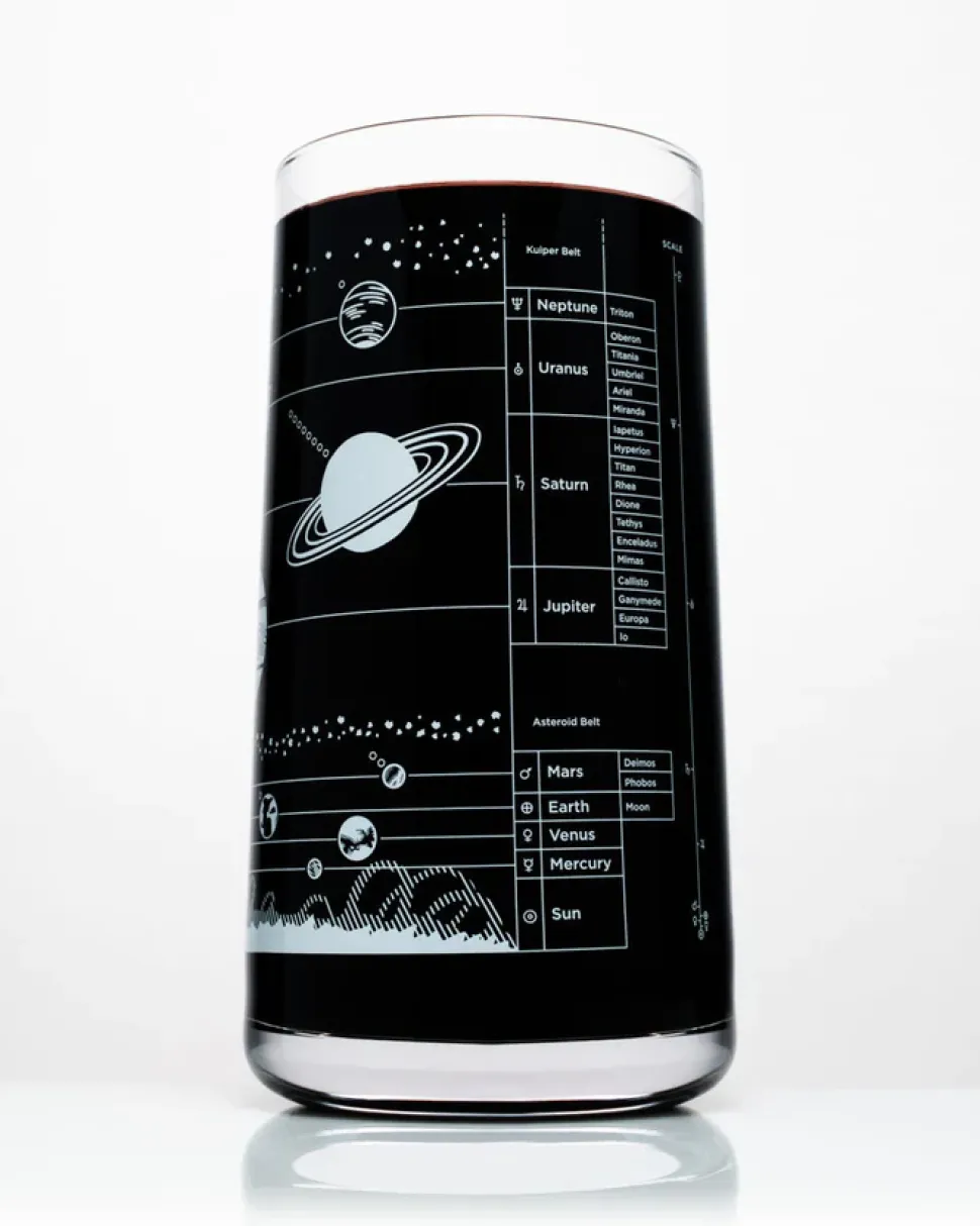Fill with ice up to Jupiter then top it up to the Kuiper belt with iced tea or your favorite fizzy drink. Muse on interplanetary exploration or let your mind winder out into the void with this Solar System drinking glass.