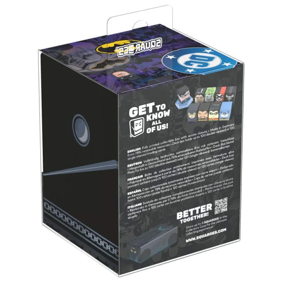 Collectible box for storing TCG decks, tabletop gaming accessories, and/or collectibles. The Bane Squaroe from the Batman: Gotham City edition holds up to 100 cards in double protective sleeves if used as a deck box. Squaroes are made from 78% renewable resources and fit perfectly into the separately available Collectors Case.