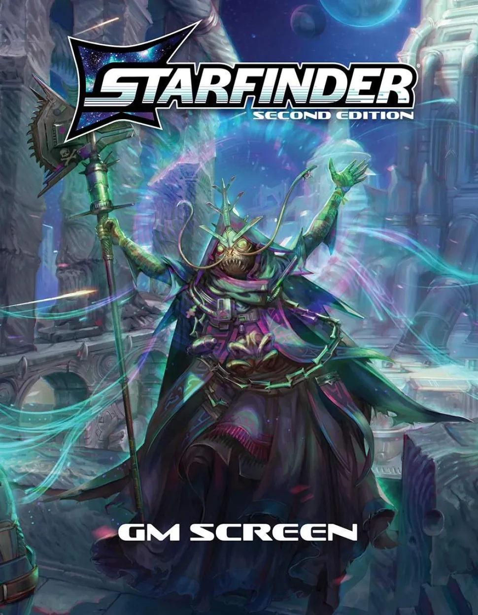 Launch your game into overdrive with theStarfinder GM Screen. This sturdy four-panel horizontal screen features a stunning battle scene on one side by legendary artist Ben Wootten and handy charts and game tables on the other side to give a busy GM everything they need to run a Starfinder game, making it simple to run any adventure or create your own! Whether you need to quickly reference a rule simply keep your star charts and other plans secured from players’ scanning eyes, the Starfinder GM Screen has you covered.
