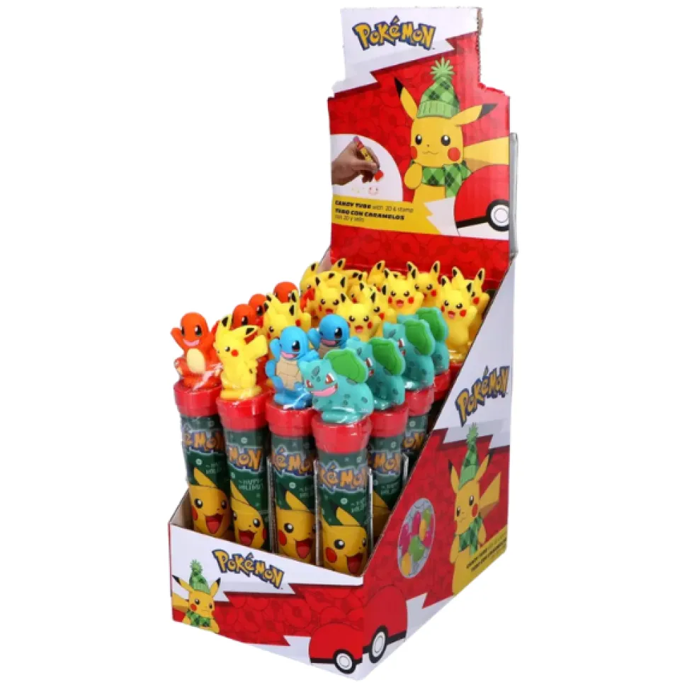 Gelebønner med jordbærsmak i tube, med liten figur og stempel med motiv fra Pokemon.