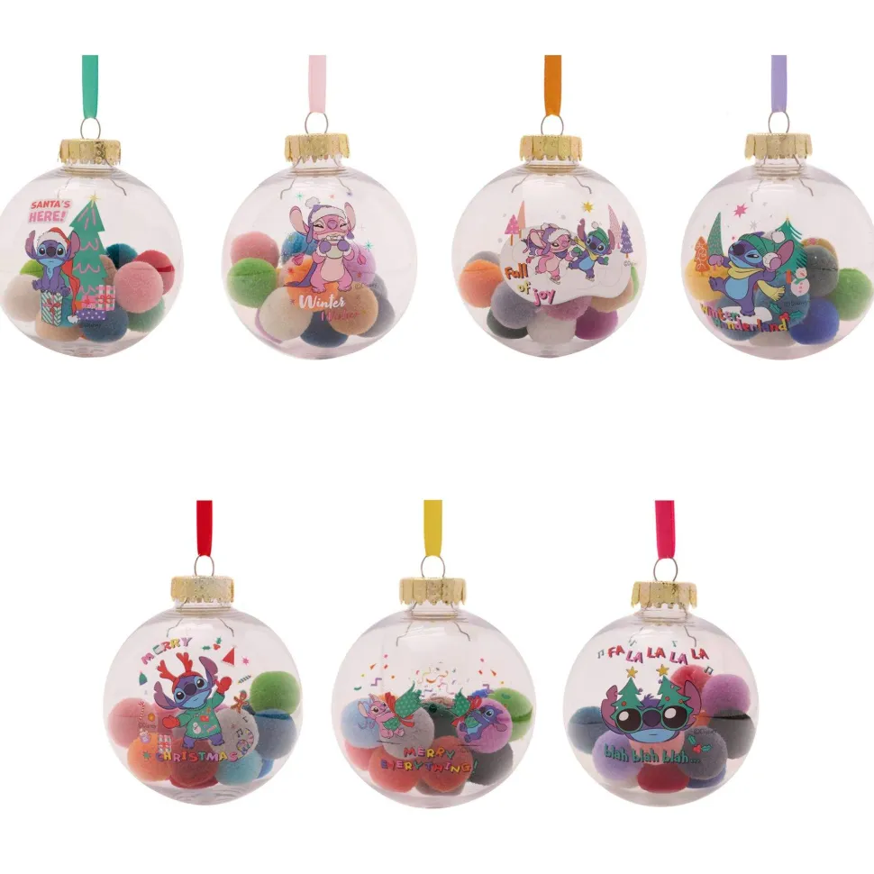 These fun-filled decorations will hang proudly and brightly from the Christmas tree throughout December. The round, transparent baubles showcase individual festive designs featuring Stitch from Lilo & Stitch, complete with colourful pom poms inside. They hang from the Christmas tree using their eye-catching ribbons.