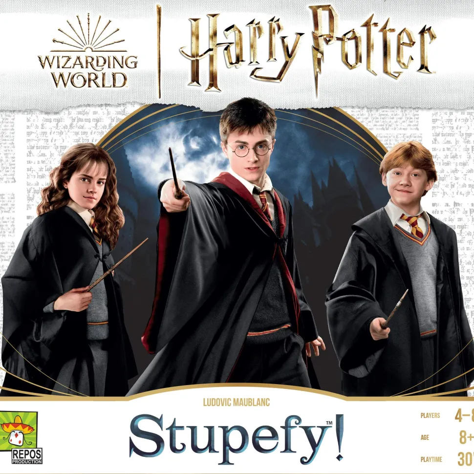 1, 2, 3… Stupefy !It’s so simple, you can learn the rules to Stupefy just by playing. Combat plays over 8 identical rounds. Choose your spell. Point your wand at any opponent, at the same time as other players. Cast your spell, at the same time as other players. Then resolve spell effects. Unharmed players gain rewards from the center of the table and drop them into their House’s box.Spells and rewardsSpells are represented by cards that players receive at the start of the game. There are Stupefy! cards and Misspell cards (it happens to the best of us). Be careful, you start with a limited number of Stupefy cards and must balance your Misspells to become your professor’s favorite, collect potions, or even point cards. Avoid being Stupefied by your opponents along the way, otherwise you’ll be known as the latecomer (penalty) of your House and miss the chance to gain extra rewards. After 8 rounds, once all the rewards have been claimed, the House with the highest score wins the game.Rounds are tense! You have to observe your opponents’ choices (have they used all their Stupefy! cards?), choose whether to protect yourself, attack, or claim all the rewards… And you have to decide quickly, in the heat of the moment!—description from the publisher