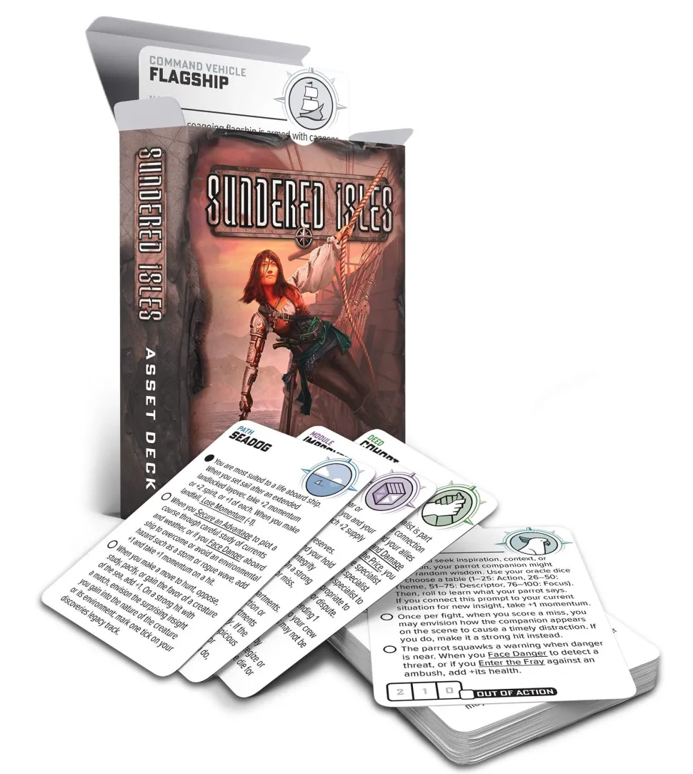 Sundered Islesoffers a vast array of new character assets for the seafaring setting, many of which are also usable in yourStarforgedspacefaring campaigns. Mix-and-match assets fromSundered IslesandStarforgedfor limitless possibilities! This high-quality deck of poker-sized cards includes 61 assets. The laminate finish is suitable for use with dry-erase markers.
