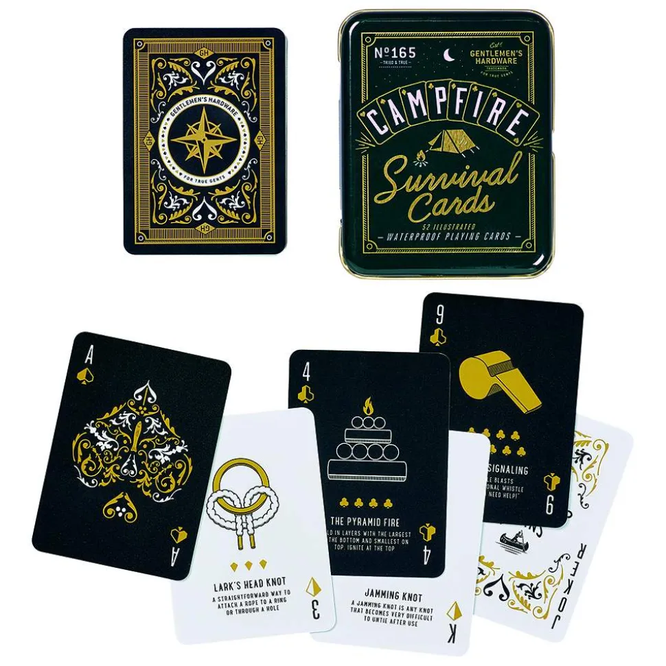 All-weather waterproof playing cards with a different survival tip or fact included on each card. Learn how to tie different knots, how to find water, what to do if you encounter a bear and much, much more. Packed in a nice metal tin with gold-effect, making it a perfect gift. Standard 52-card deck so that you can play everything from crazy eights to bridge. 52 waterproof playing cards Pack size: 105x85x20 mm