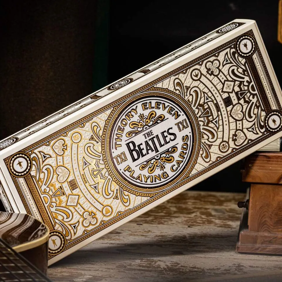 A breathtaking, ivory and gold foil box containing one of each of The Beatles Premium Playing Cards. The box is wrapped in intricate, elegant design on almost every surface – and sealed with a magnetic closure. Handcrafted in the USA using FSC-certified paper.