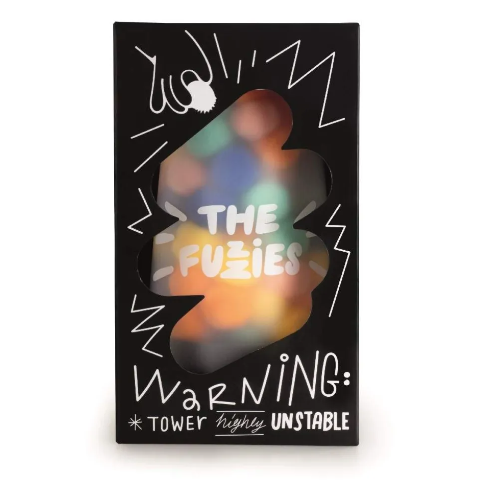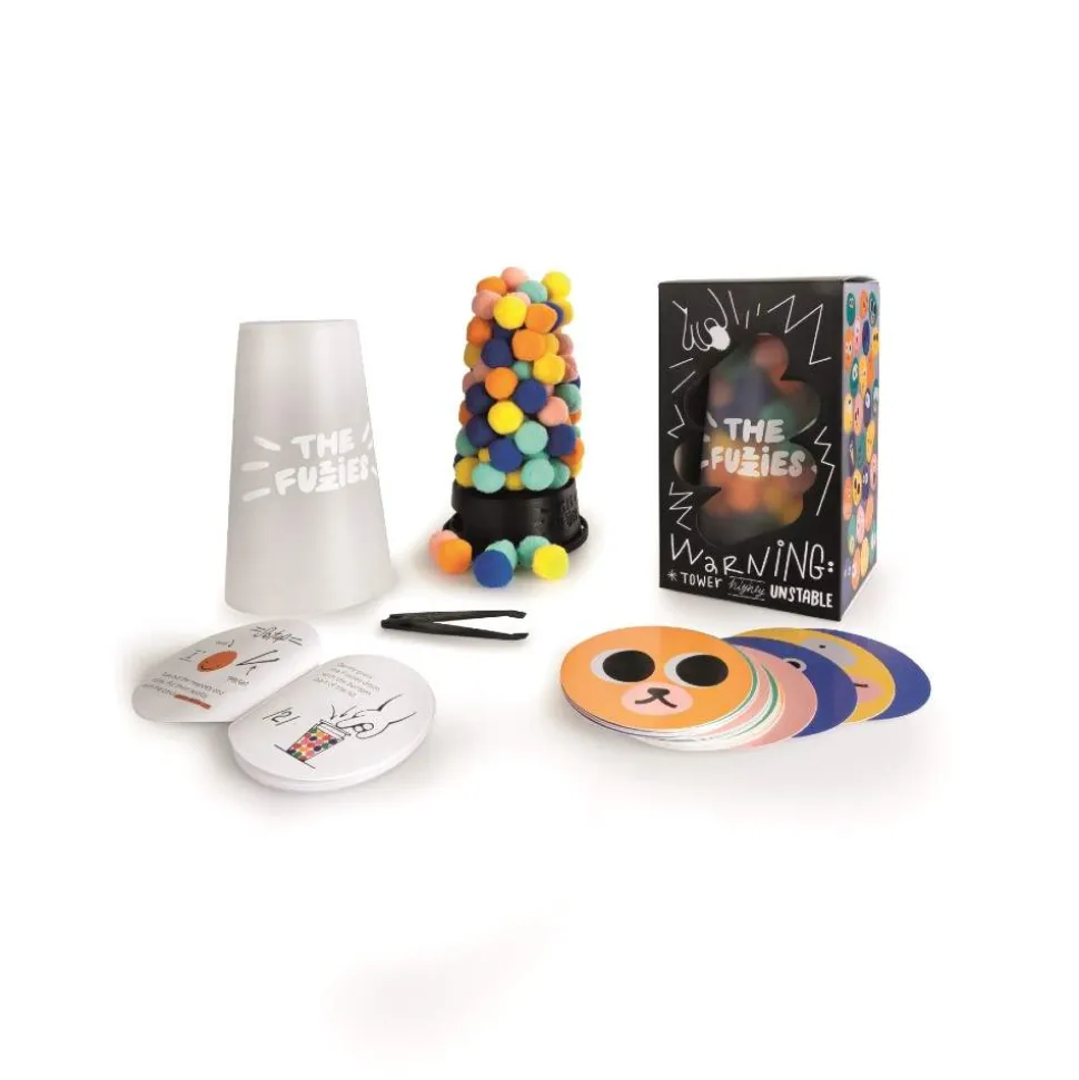 The Fuzzies is a game about creating gravity-defying towers out of fuzzy little balls.Draw a card a remove that color of fuzzy using either tweezers or your fingers but you can not get out of your seat. Stick it anywhere higher on the tower.If you are successful then the next player goes but if any balls drop, you must draw cards equal to the number of balls dropped and do the challenge on your next turn (e.g. remove a Fuzzy while covering your eye)The game ends when someone oafishly knocks over the tower. That player is the loser, everyone else wins!Components:95x Fuzzies30x circular cards1x circular rulebook 1x plastic container with dual purpose lid/platform 1x tweezers-description from designer