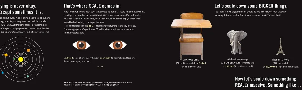 At a 100,000,000,000-to-1 scale, the Sun is about the size of a dime. And five feet away from the Sun, we find… Earth, the size of a pinhead. A hundred-billion-to-one scale is not nearly small enough to fit our solar system into a book (or onto a soccer field)! How small do we need to go? Unfold the next three spreads to find out…