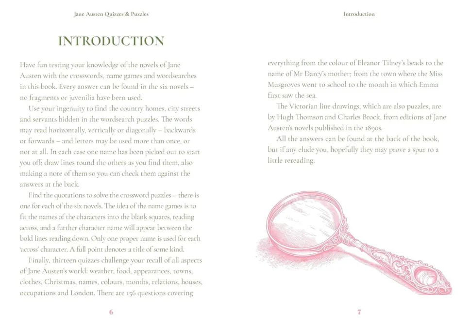 Use your ingenuity to find the country homes, city streets and servants hidden in the wordsearch puzzles. Find the quotations to solve the crossword puzzles – there is one for each of the six novels – and play the name game to see how many of the 156 quiz questions you can answer, from the colour of Eleanor Tilney’s beads to the name of Mr Darcy’s mother; from the town where the Miss Musgroves went to school to the month in which Emma first saw the sea.