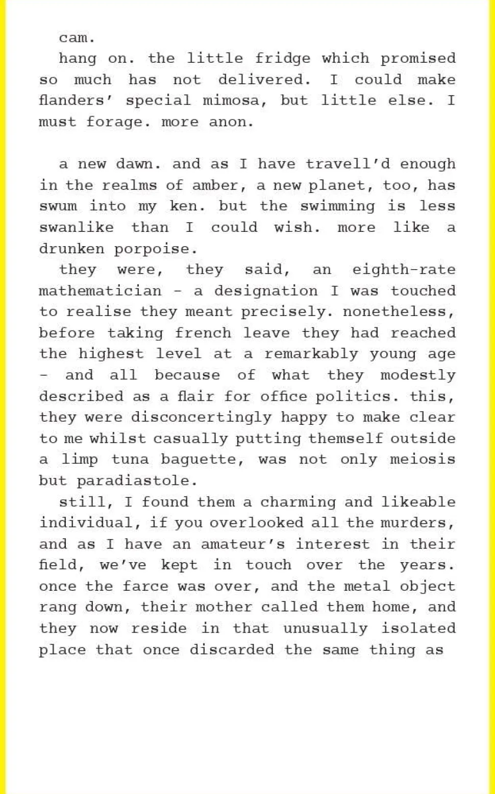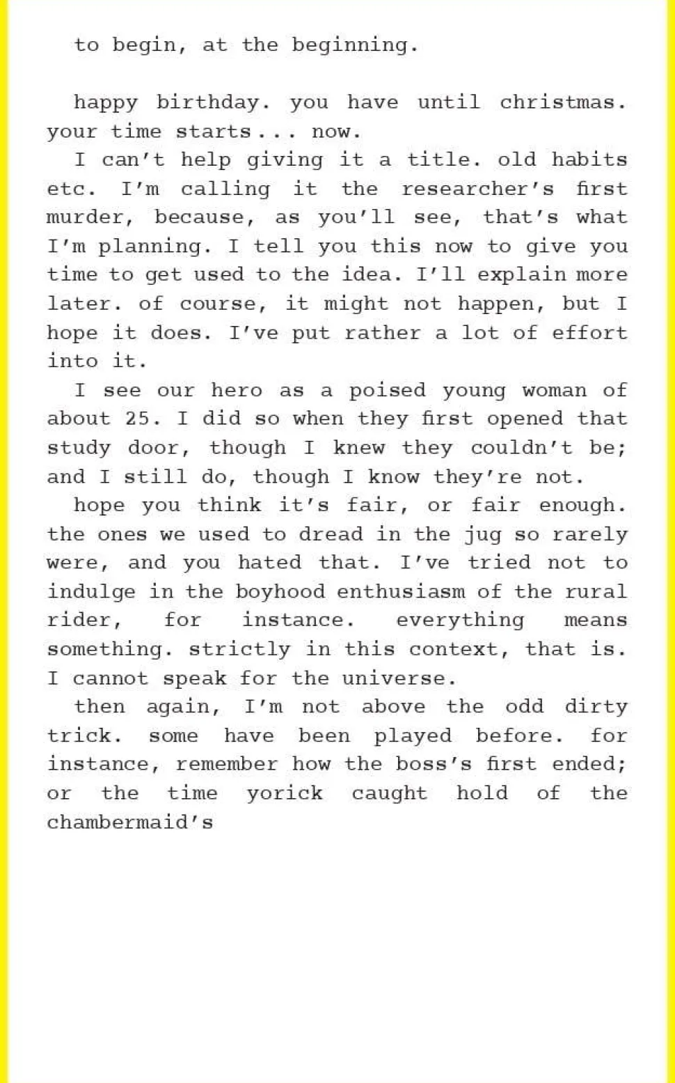 A body is found stabbed to death in a locked room. The police find no weapon, no motive and no suspects. However, the murderer has in their possession a box of one hundred cryptic picture postcards which – if properly understood – would explain not just this murder, but nine others. These are those cards.