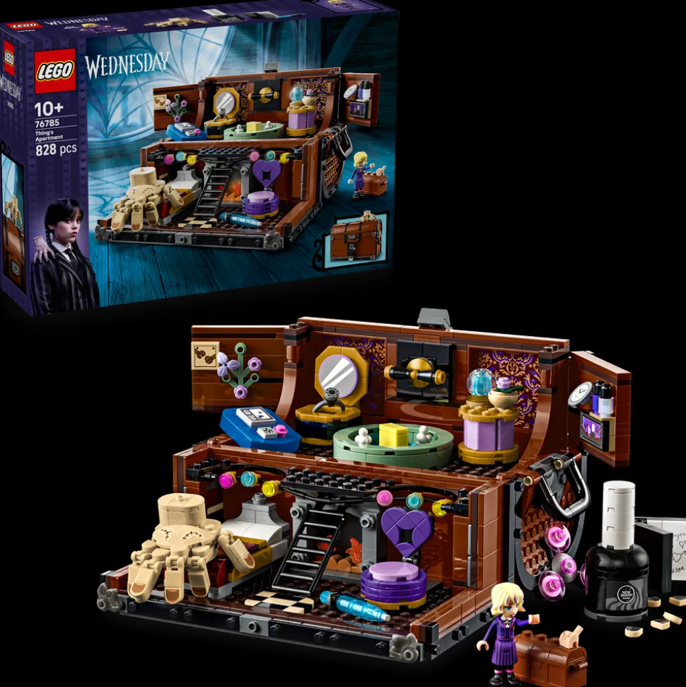 Endeløs, bærbar huslek venter Wednesday-fans fra ti år og oppover i dette detaljerte LEGO® byggesettet Wednesday Tings leilighet (76785). Denne kreative leke- eller utstillingsmodellen er en morsom bursdagsgave til barn og har en koffert som kan åpnes, og inkluderer en seng, stol, lue og klokke, plass i kofferten til klistremerker, pussemiddel og håndkrem, og mer. I tillegg kommer den med en bevegelig Ting-figur og en Enid-minidukke.