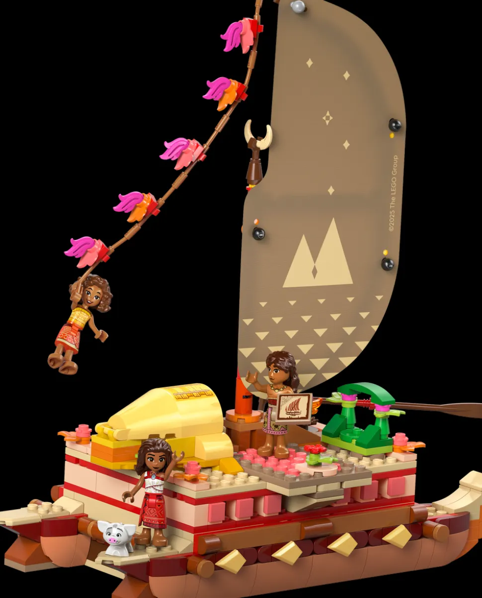 - Disney-lekesett – byggbar kanoleke med dobbelt skrog, mønstret stoffseil og en lei hulu av tau som brukes til å bestemme vindretningen, samt et lite hus til grisen Pua, halvtak for Vaiana og mer