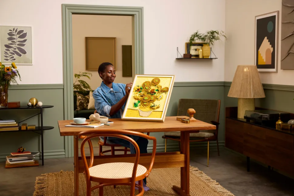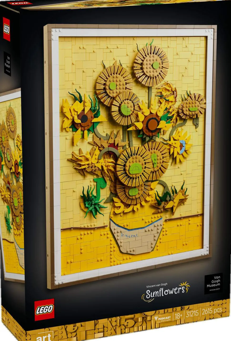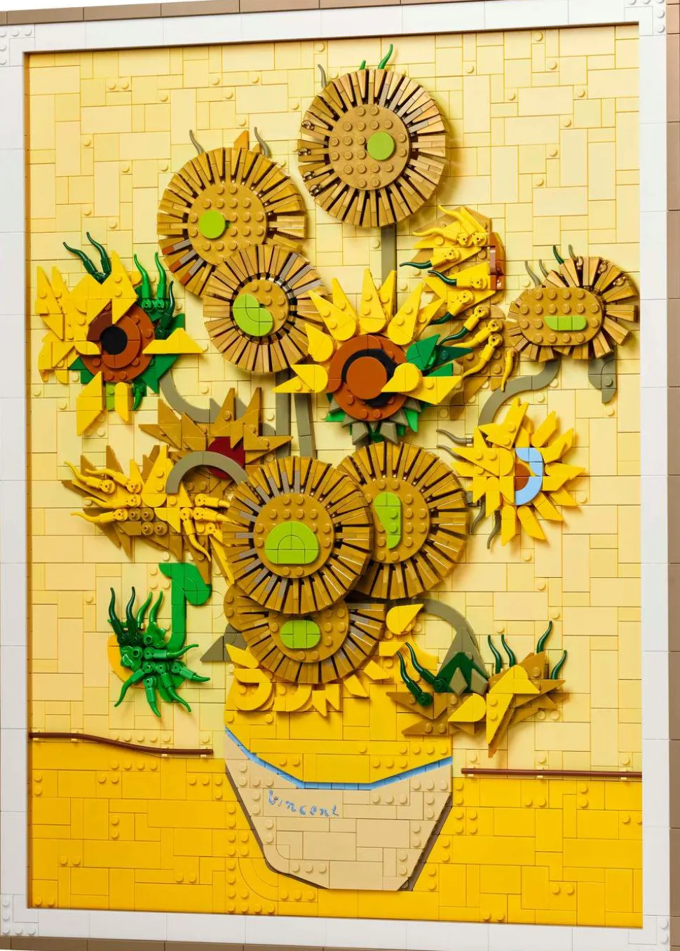 La deg imponere av Van Goghs geni og hans sprelske bruk av farger i dette settet som gjenspeiler maleriets tre nyanser av gult og Van Goghs berømte bruk av lys og skygge. Dette LEGO veggkunstsettet består av 2615 deler og består av 16 solsikker med justerbare kronblader, en avtakbar ramme, en flis med Van Goghs signatur på og et opphengselement til å henge det på veggen med.