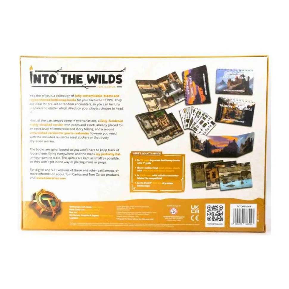 Into the Wilds is a collection of fully customizable, biome and region themed battlemap books for your favourite TTRPG. They are ideal for pre-set or random encounters, so you can be fully prepared no matter which direction your players choose to head in. The battlemaps come in two variations, a fully-furnished highly-detailed version with props and assets already placed for an extra level of immersion and story telling, and a second unfurnished version for you to customize however you need with the included re-usable asset stickers or that trusty dry-erase marker. The books are spiral bound so you won’t have to keep track of loose sheets flying everywhere, and the maps lay perfectly flat on your gaming table. The spirals are kept as small as possible, so they won’t get in the way of placing minis or props.