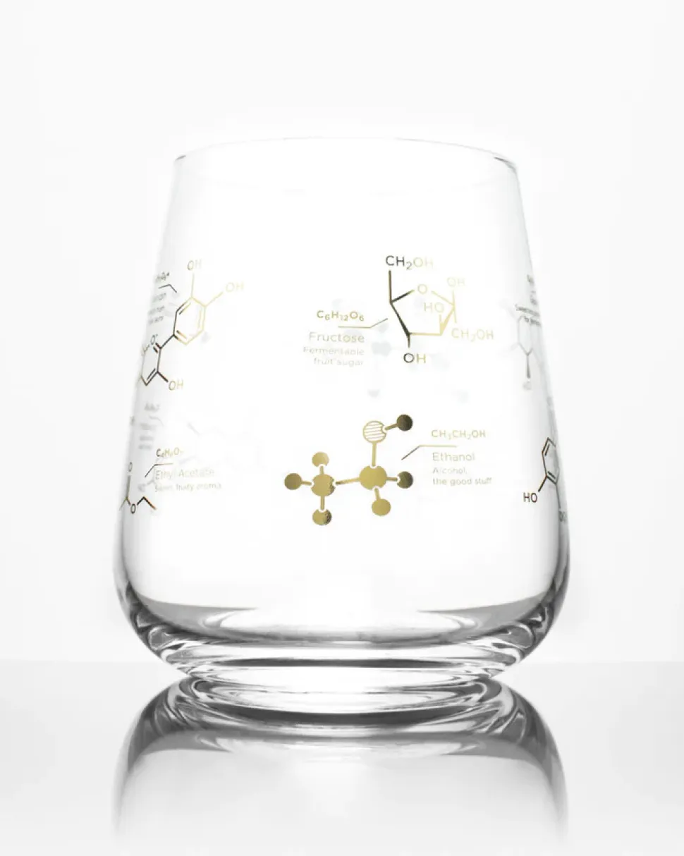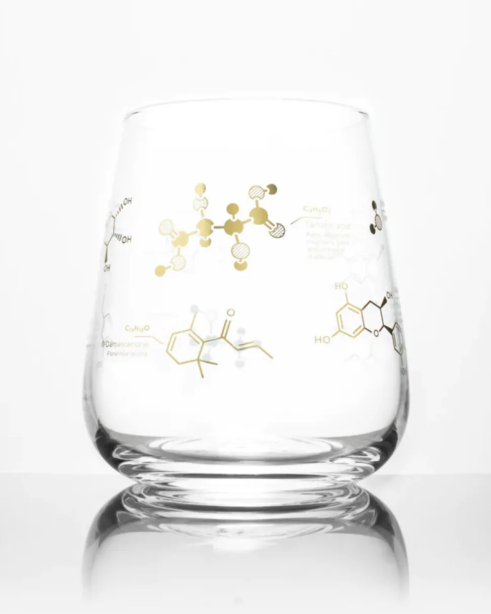 This Wine Chemistry Glass is for wine connoisseurs, chemists, andanyone who appreciates that wine is so much more than just the ethanol. Celebrate the complex bouquet of molecules that give your favorite wine its unique qualities and flavors. You’ll find molecules such as vanillin, which brings a sweet creamy taste – or ethyl acetate, which imparts sweet, fruity notes.