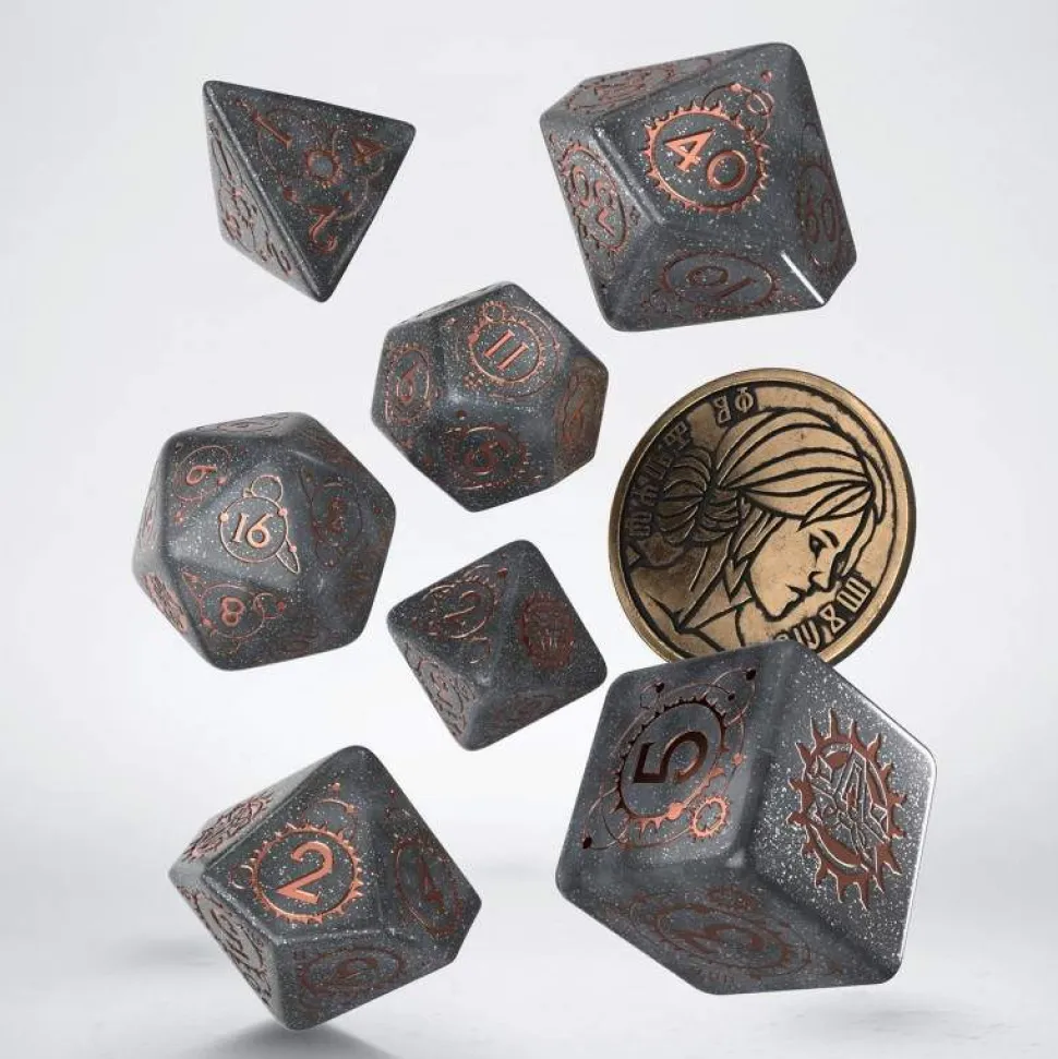 An heir to Lara Dorren.Inspired by The Witcher franchise, this dice set is dedicated to Cirilla Fiona Elen Riannon, a carrier of Elder Blood. The set contains 7 polyhedrons, and a metal coin featuring Ciri’s depiction. Each dice has white material with aquamarine engravings. The highest value faces, and coin reverse, are adorned with the School of Cat symbol.