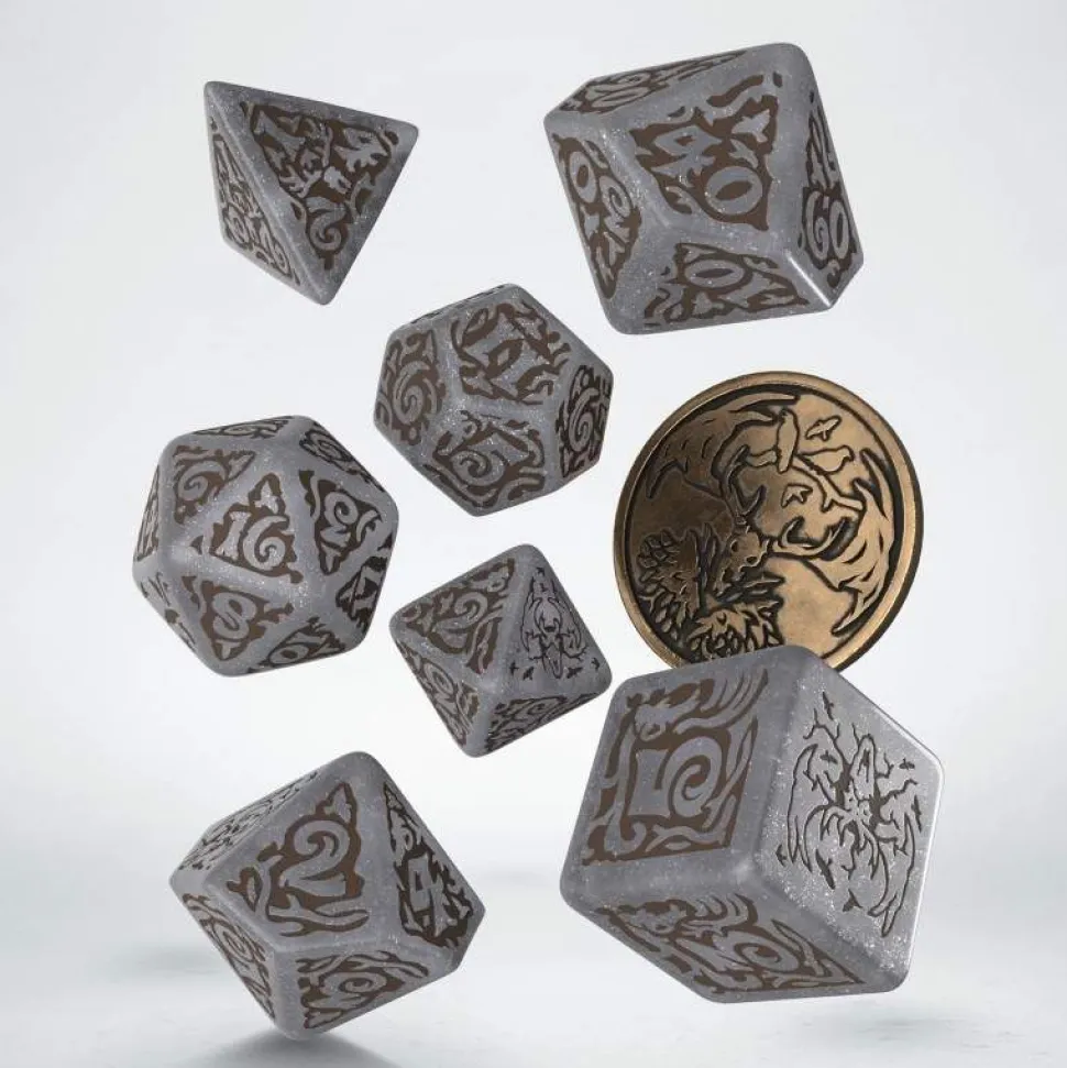 A predator of many faces.Lo and behold: this dice set, inspired by The Witcher franchise, is dedicated to the leshen — a monster capable of changing its shape. The set contains 7 polyhedral dice and a metal coin. Each dice is painted shimmering-gray with brown engravings. The highest value faces and the coin reverse share imagery with the leshen’s horned skull; the crows rule over the obverse.