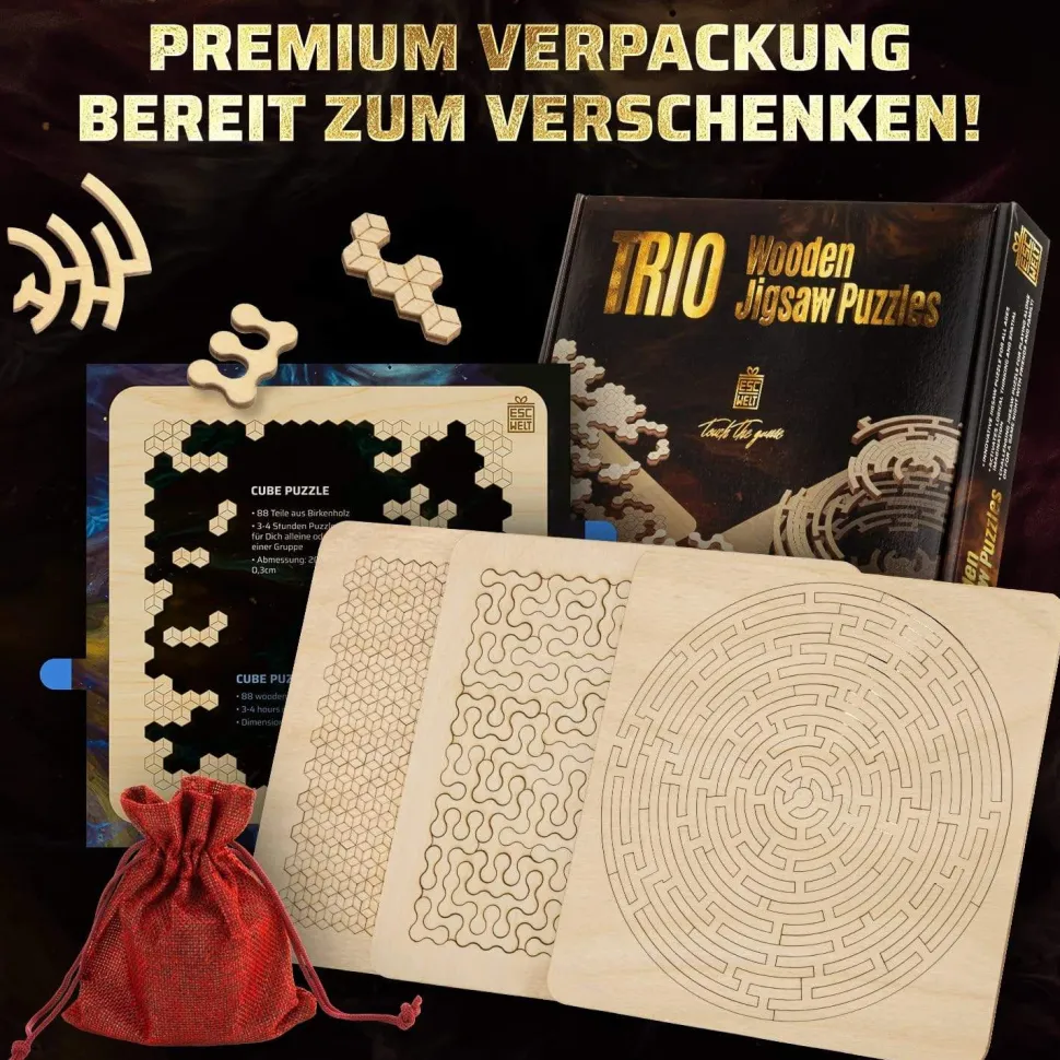 Puzzle set with wow factor: 1 box contains 3 exciting puzzle challenges. Each puzzle is made of high-quality wood and has a unique shape, which guarantees different levels of difficulty. The set contains more than 170 puzzle pieces. However, do not be fooled, because here more patience is needed than you think, because you do not have an image or pattern for orientation.