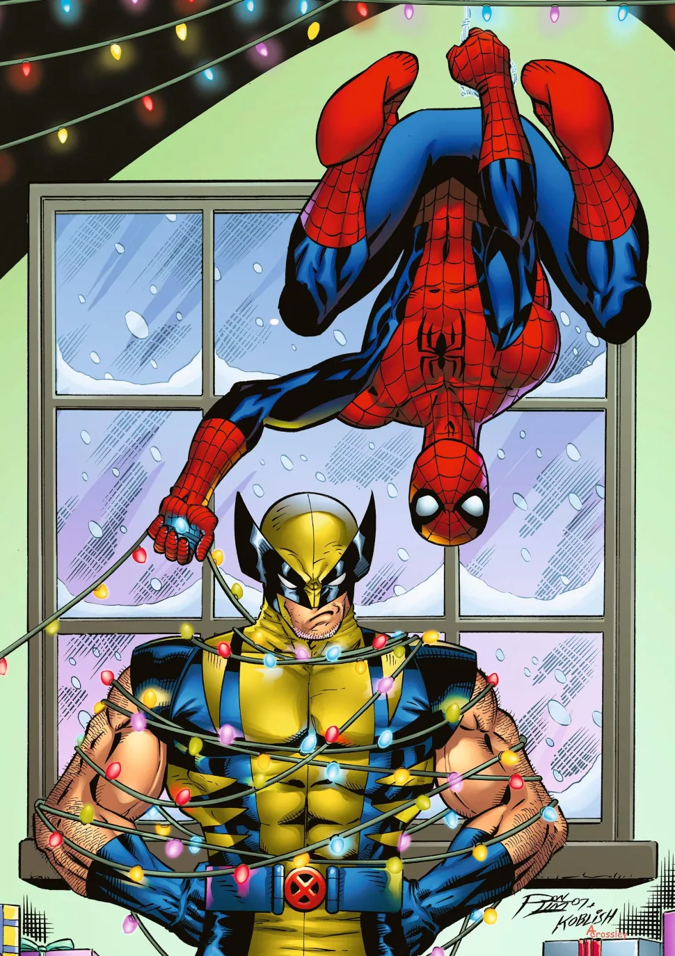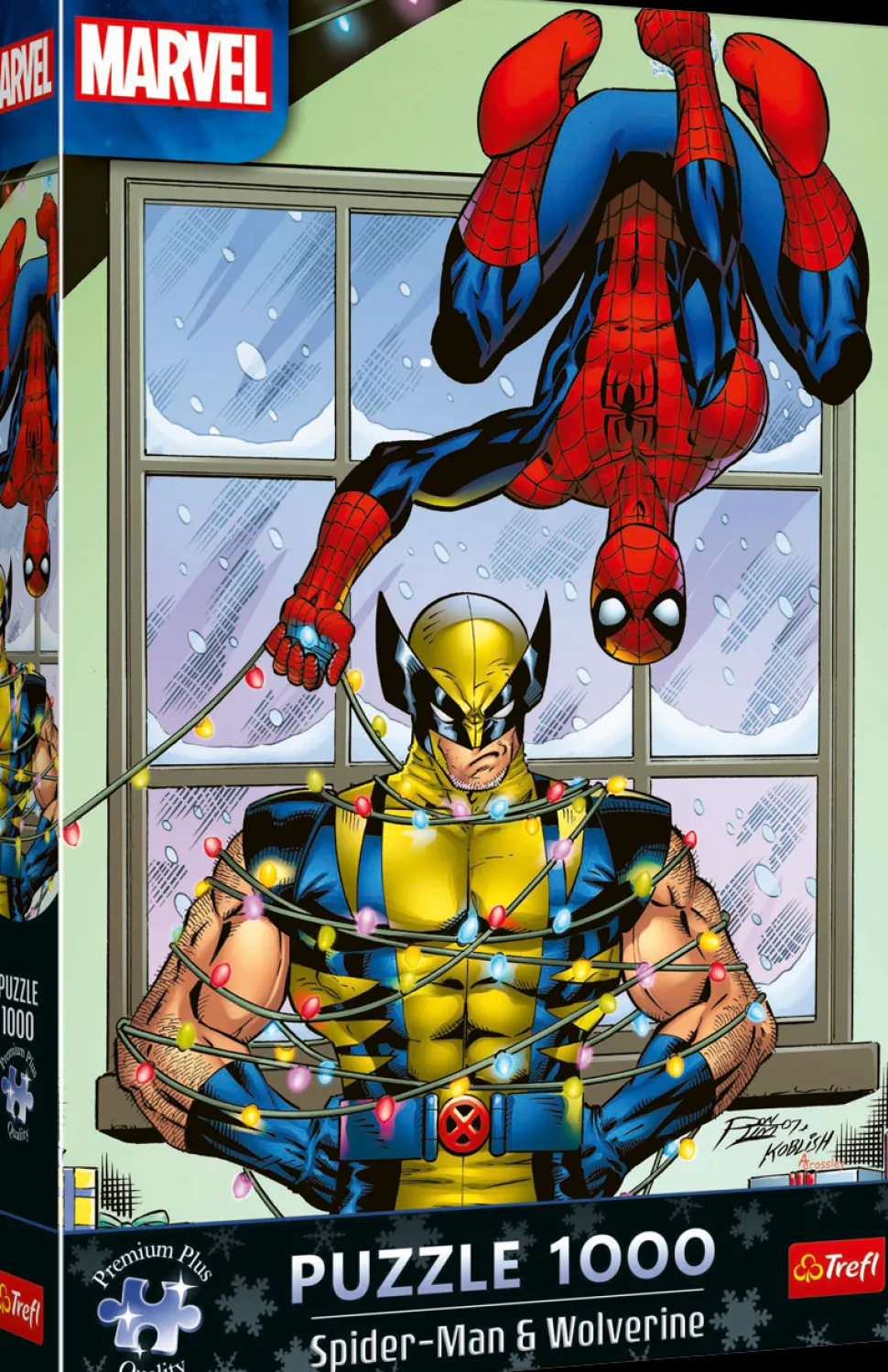 Spider-Man & Wolverine: Christmas puzzles present heroes from the Marvel universe in a holiday edition. After arranging them, an image with dimensions of 683×480 mm will be created.